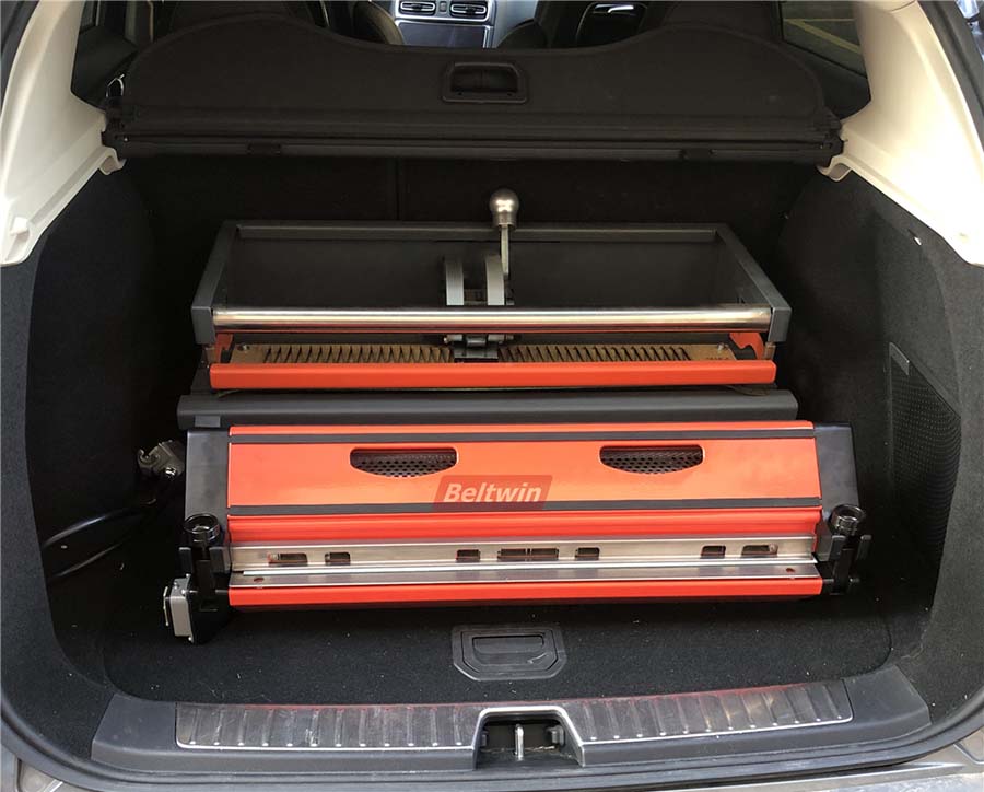 Nous allons utiliser une presse de refroidissement par air tout-en-un 600 et un poinçon manuel portable 600, pour une largeur de bande de 560 mm, une épaisseur de 2 mm, pas besoin de séparer les couches. On est prêt à partir avec 2 machines dans le coffre, petit volume et léger, donc pratique.