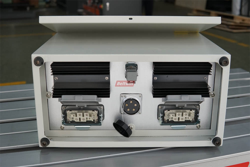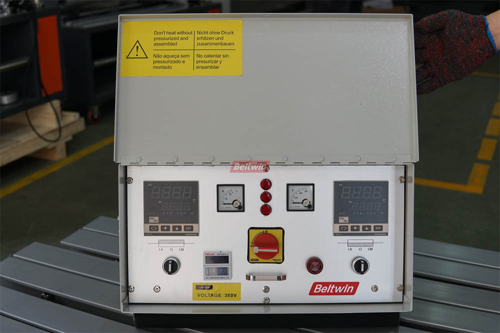Un boîtier de commande pour 2 plateaux. Une fois la température de chauffage des deux plateaux, le temps de séjour, la température de refroidissement et la pression réglés, l'ensemble du processus d'épissage se déroulera automatiquement. Buzzer automatique de fin de cycle. Comprend 2 pièces de contrôle et d'indication de température numérique SHIMADEN, 1 minuterie, 2 ampèremètres et un voltmètre. Le même standard qu'Almex, échange facile par votre ancien système de contrôle de presse de vulcanisation Almex. Plus flexible et économisez des coûts. Température et lecture précises, composants électriques homologués CE.