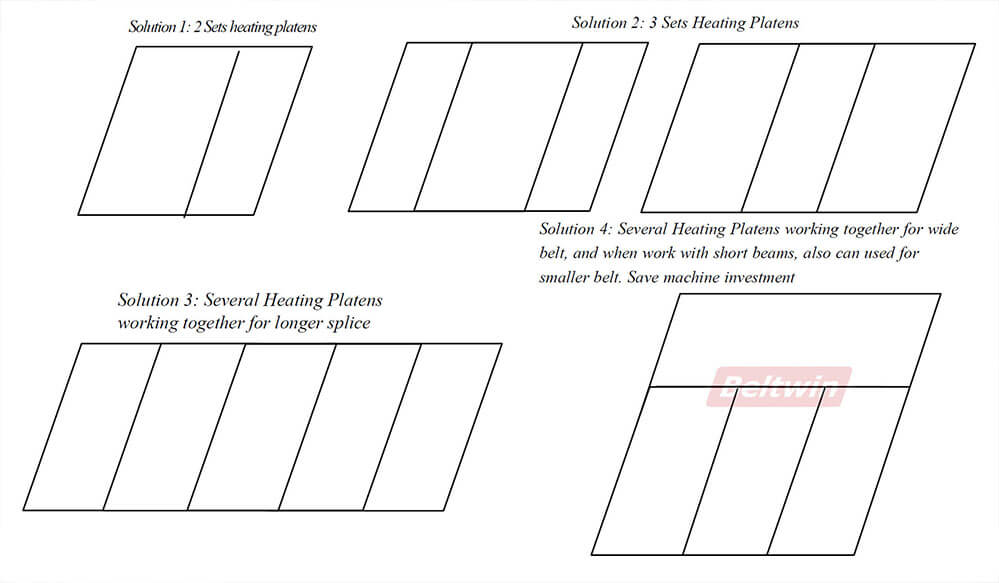 - Peut offrir une solution totale, une presse de vulcanisation avec des poutres supplémentaires peut être utilisée pour plusieurs largeurs de bande.