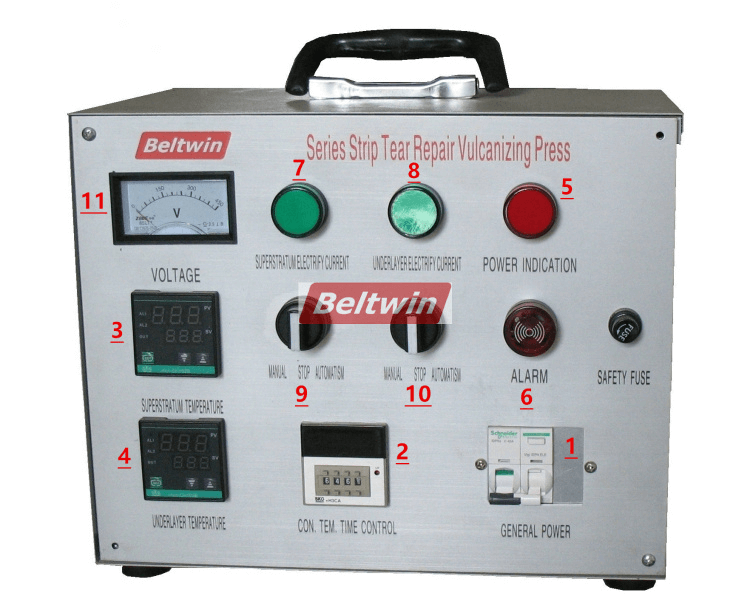 Presses de réparation de bandes transporteuses Beltwin Spot, légères, utilisées pour la réparation ponctuelle de bandes transporteuses en caoutchouc. 2 tailles : largeur de bande max inférieure à 1800 mm et 2400 mm. Structure en alliage d'aluminium à haute résistance - Robuste. C'est une machine fiable, légère et portable, qui est largement utilisée dans le domaine de la métallurgie, des mines, des centrales électriques, des ports, des matériaux de construction, du ciment, des mines de charbon, de l'industrie chimique, etc.